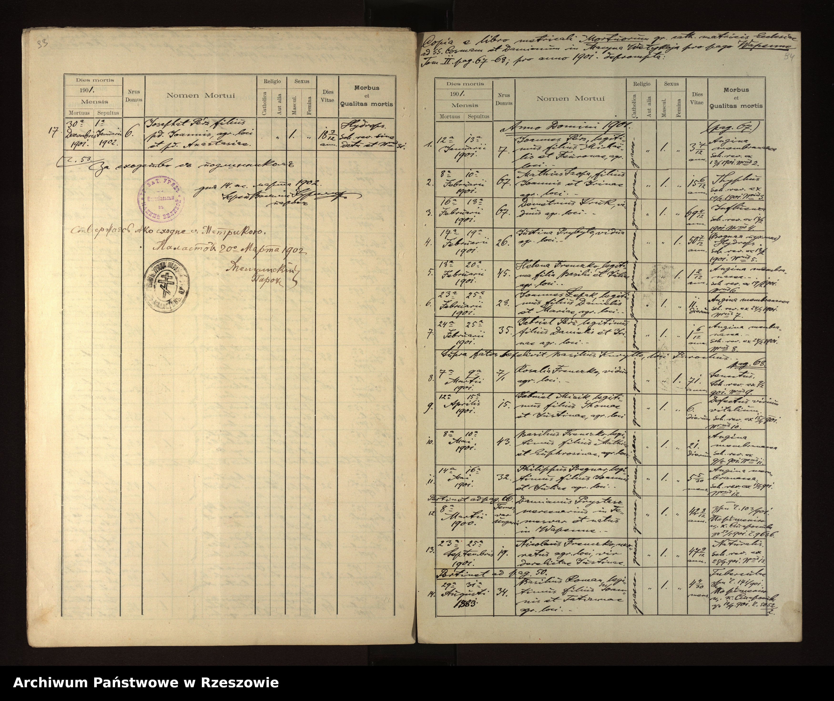 | 1 | 1901.12.30 | Rozdziele | 6 | Josaphat Perz | Catholic | male | 18 3/12 | hydrops | Joannes Perz | Anastasia Perz |