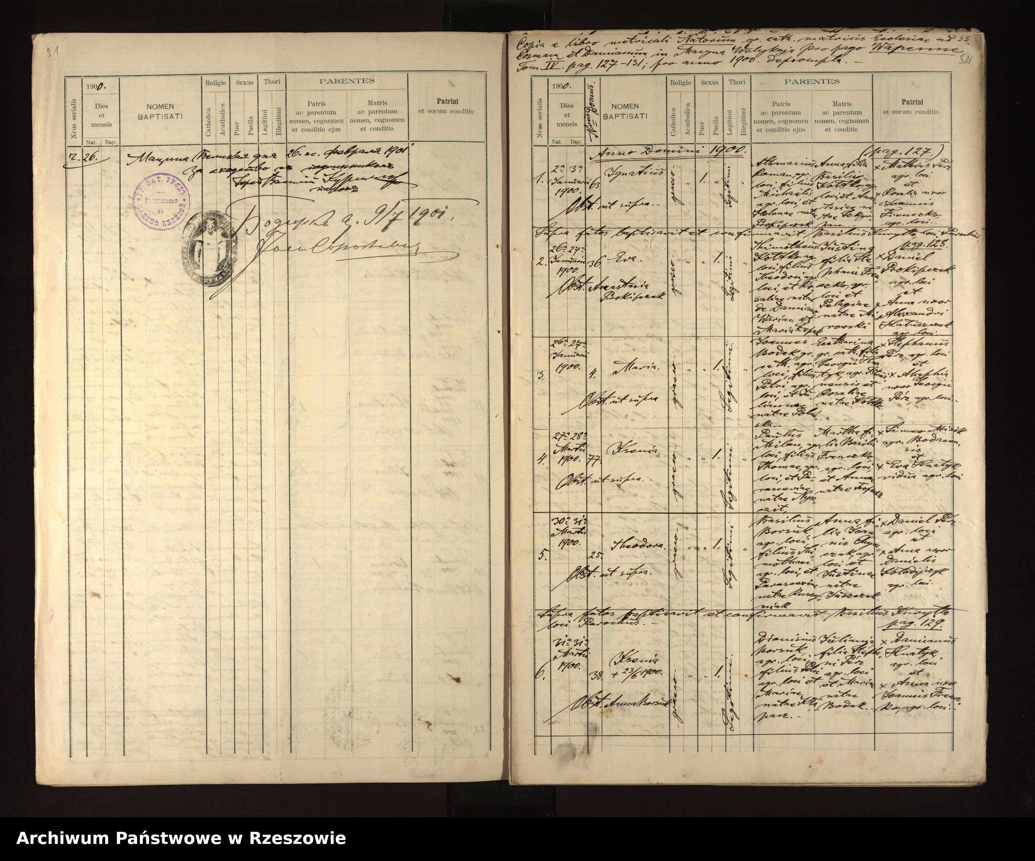 | 5 | 1900.03.30 | Wapienne | 25 | Theodora Borsuk | Catholic | female | Basilius Borsuk | Anna Chymczak | ||