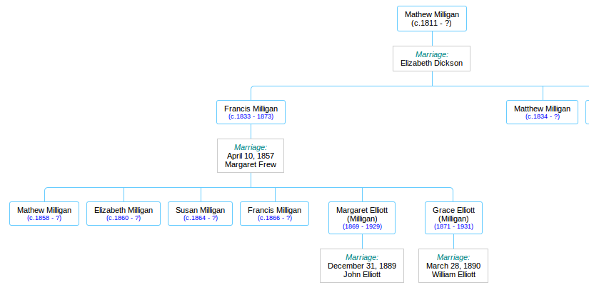 William's father John Elliott was born in 1859 in County Fermanagh, Ireland. John's grandfather Archibald Elliott (born about 1781) was a tenant farmer in County Cavan, Arva, Killashandra parish. While the family no doubt originated long ago in Scotland (the Elliotts/Elliots/Eliots are traditionally a clan from the Scottish lowlands close to the English border), they spent several generations in northern Ireland as part of the Ulster Plantation. John and his sister Mary Jane were both born in Ireland, and at some point between 1861 and 1864 (when John was between two and five) the family moved to Paisley where at least six more children were born: James Ingram, (another) William, Sarah Ann, Bessie, Margaret, and Archibald.