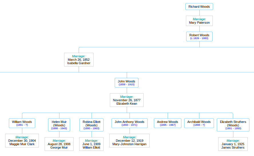 Her father John Woods (born 1859) was a carter by trade. John married Elizabeth Kean (born 1858) in 1877 in Johnstone, a town in Renfrewshire not far from Paisley. John's parents were both born in Ireland and came to Paisley around 1850 seeking better opportunities in the bleachworks of Paisley. The Kean family came from Wigtownshire (now Dumfries and Galloway) in the south of Scotland. Elizabeth's father and her mother's father were both shoemakers.