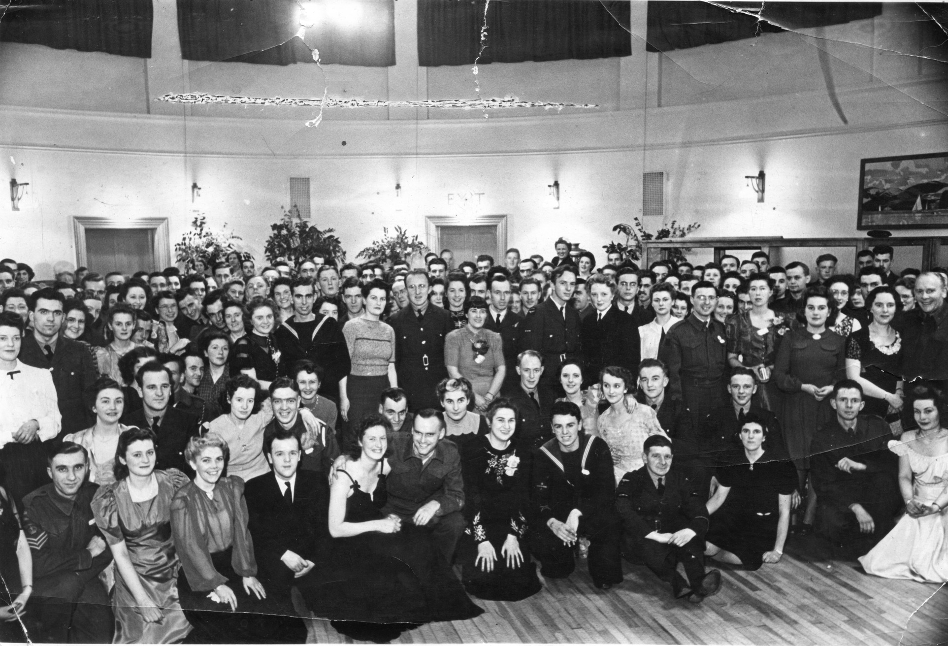 Group photo taken at The Beaver Club, probably spring 1944. John and Kathleen can be found on the lower left side, kneeling, just behind the front row. Kathleen's arm is around John's neck.